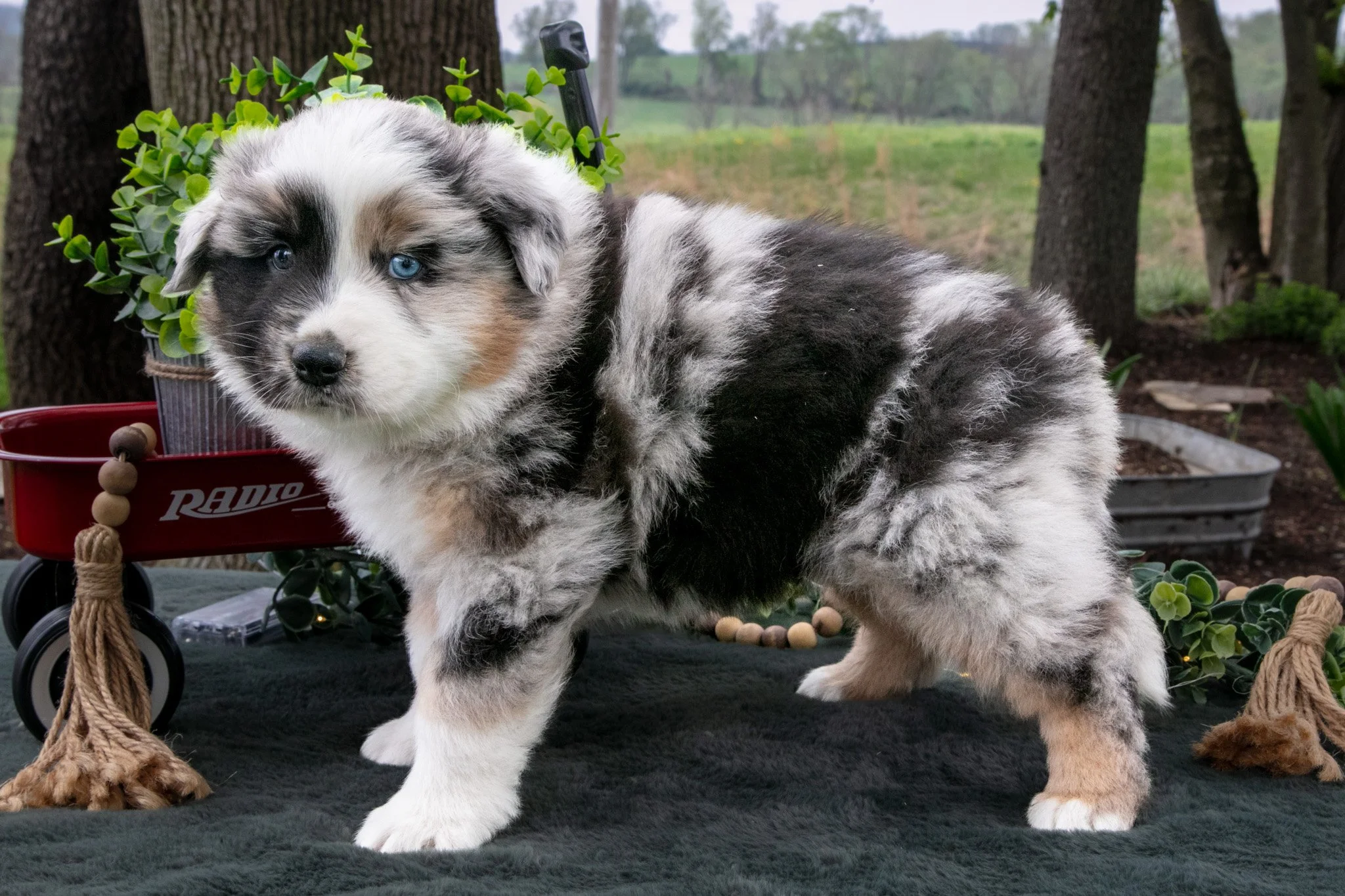 Here comes Bandit! This stunning Australian Shepherd puppy is ready to cozy up with you as the weather gets cooler! He is family raised with kids and spoiled to the brim with love and attention. He will be vet checked, up to date on shots and wormer, and includes a 6 month genetic health guarantee provided by the breeder! To welcome this gorgeous puppy into your home, please contact us today!