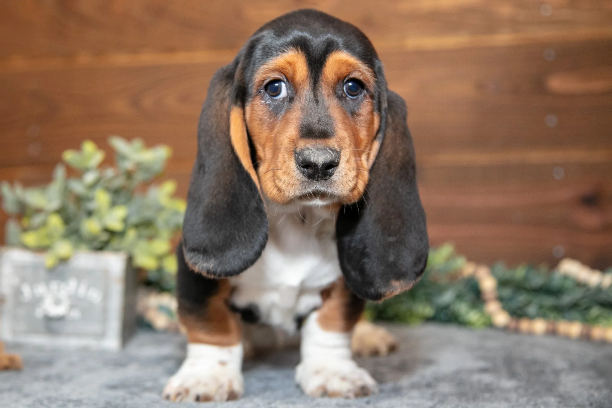 Here comes Dexter! This adorable, floppy-eared Basset Hound puppy is full of love and is ready to cuddle up with you. Dexter is full of boundless energy and loves to play. He is family raised with children, so he will fit in well with any family. He will be vet checked, microchipped, up to date on shots/wormer and AKC registered. He also comes with a 2 year genetic health guarantee provided by the breeder. To meet this adorable pup, please contact us today!