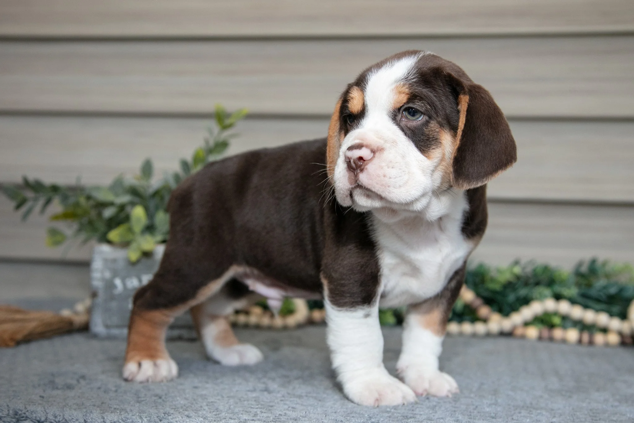 Here comes Alfie! This adorable Beabull is one of a kind and will surly turn heads. This charmer is covered in cute wrinkles and loves to cuddle. He is family raised with kids and ready to play the day away! He will be vet checked, up to date on shots and wormer and microchipped! To learn more, please contact us today.