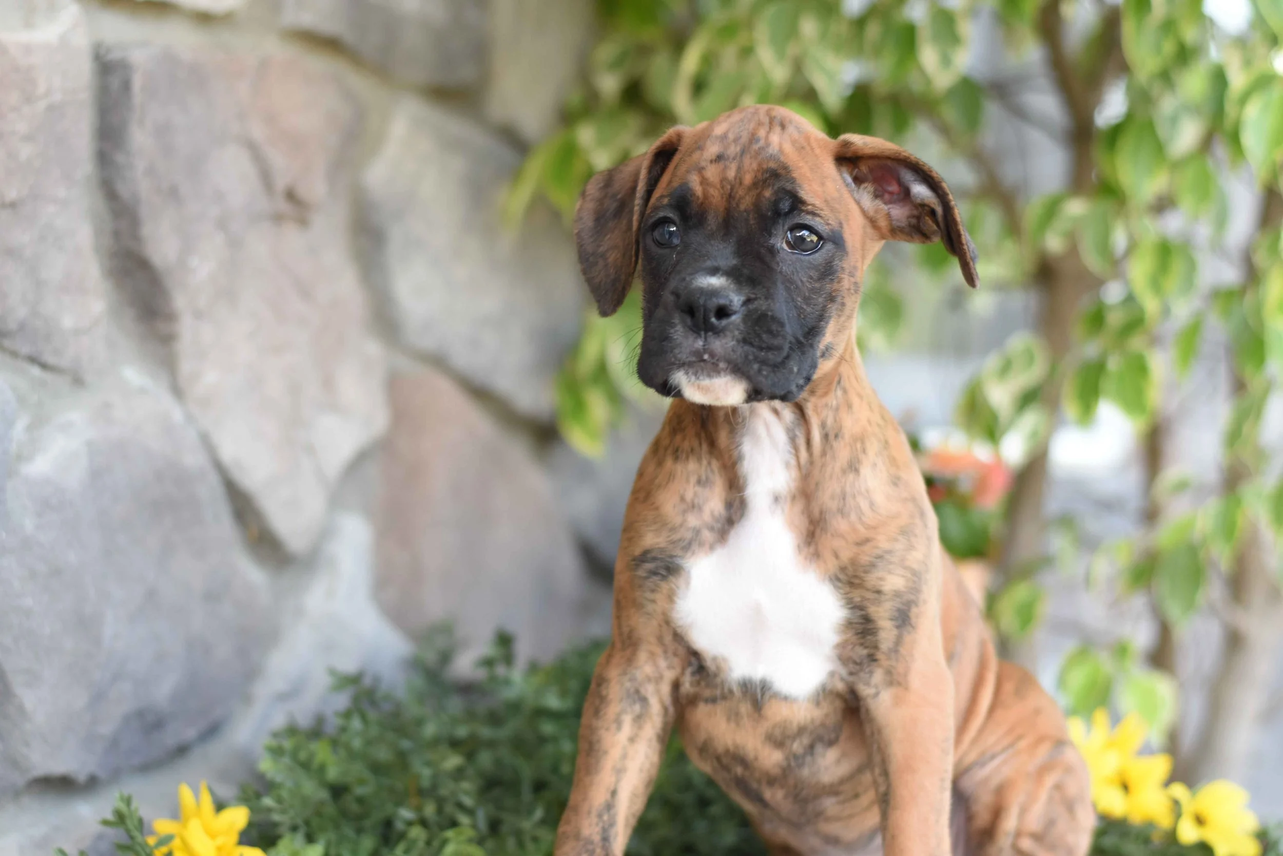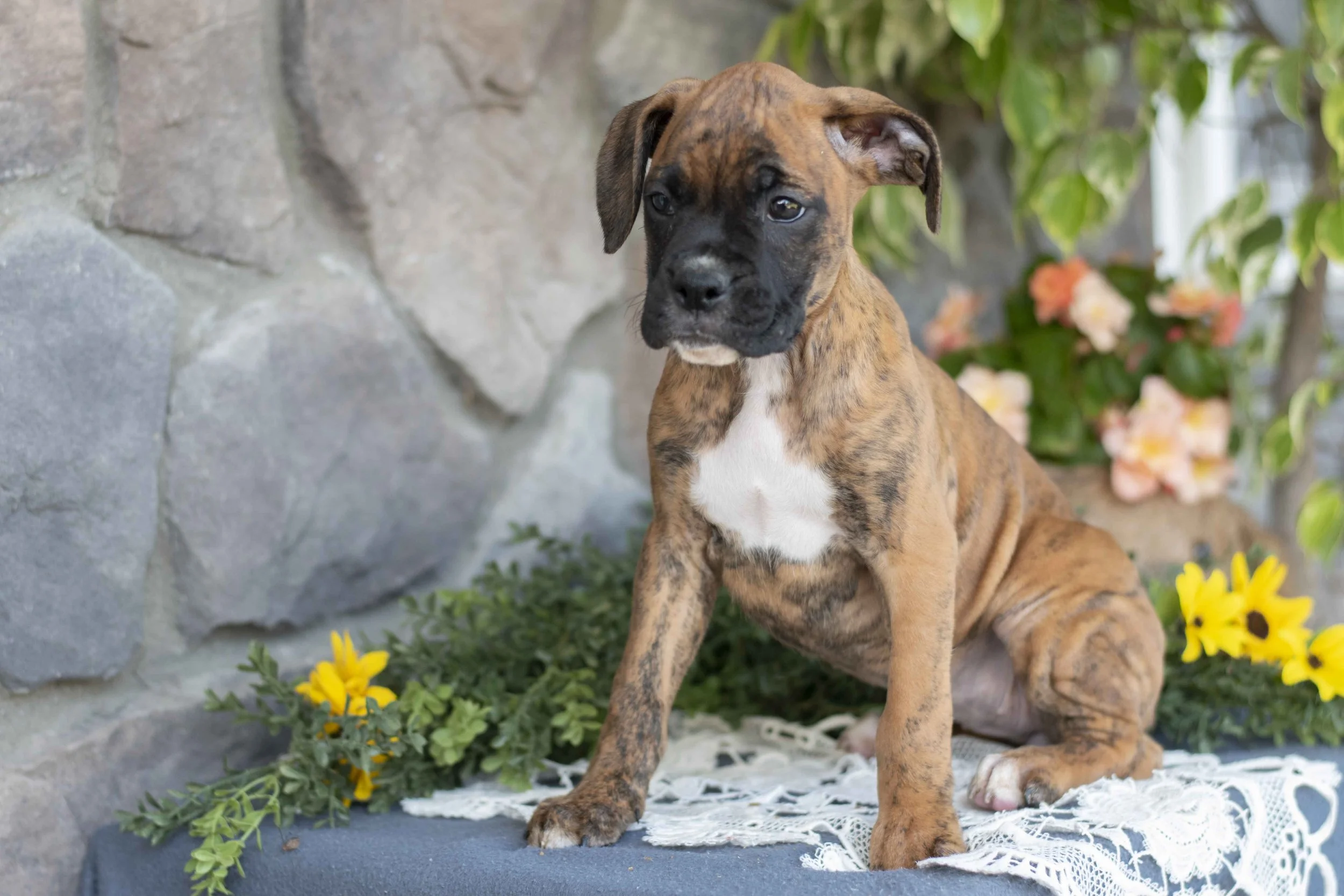 Hi! I am Daisy! I'm an adventurous, happy puppy, born one rainy, Friday afternoon in July. I have been raised by a loving family and love to romp and play with the children. My parents are on the premises and would love to meet you as well! My dad, Moe Joe, is a 75lb. AKC registered, Brindle boxer who loves romping around the farm, but is a gentle giant around little children and our other pets. My mom, Sheila is a 58lb. AKC registered fawn boxer who loves spending time with her family, and getting as much love and treats as possible. She is very gentle with little kids and the rest of our furry friends. I am up to date with vaccinations and deworming and got a clean bill of health from the vet! Yay! I am ready to meet my perfect forever family anytime now. Contact Evergreen Puppies today to learn how you can meet me!
