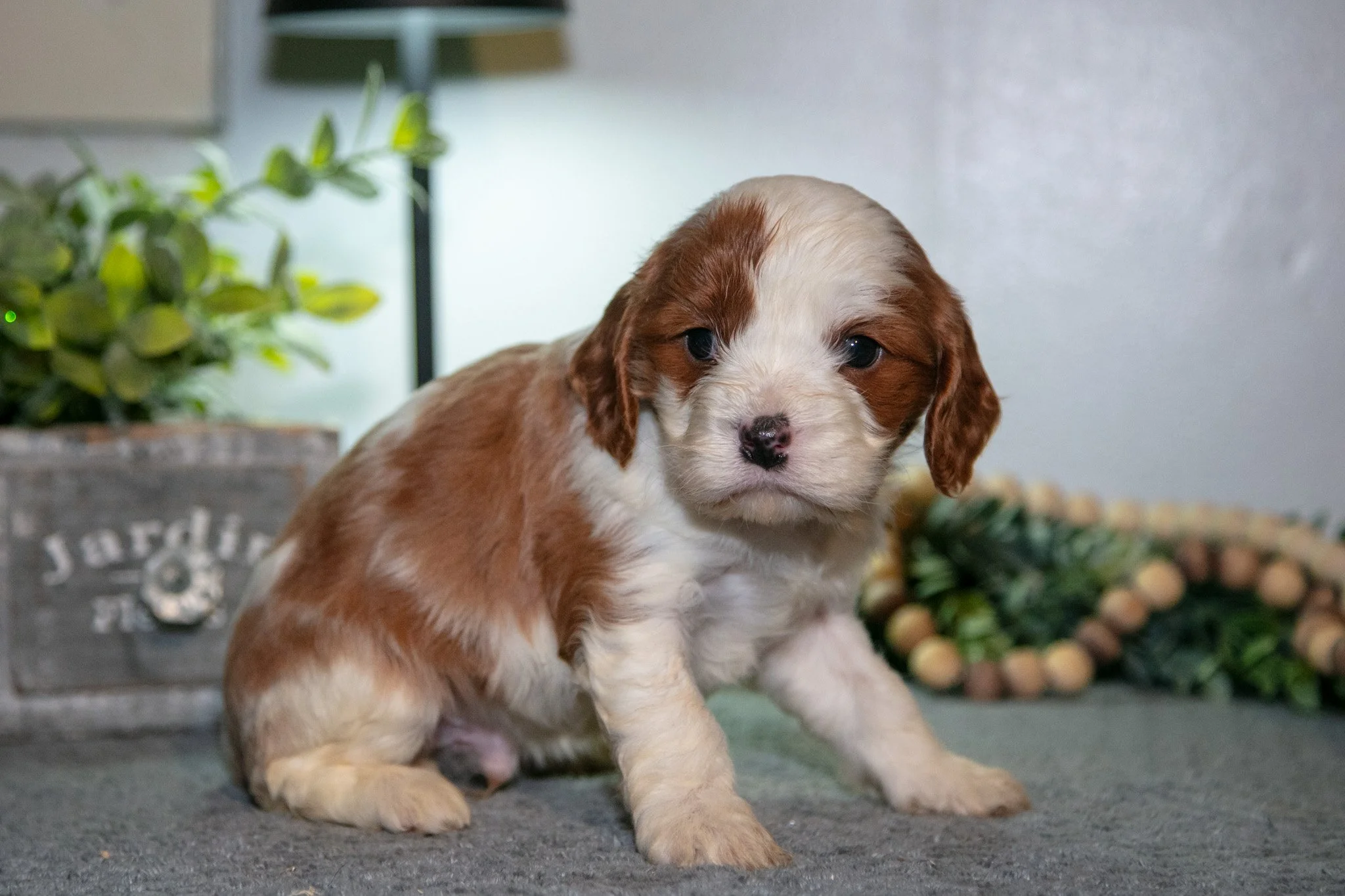 Get ready to meet Jett! This stunner of a Cavapoo puppy is ready to play! He loves attention and snuggling. He is family raised with children and will make a warm and welcome addition to any home! He is vet checked and up to date on shots and wormer! To welcome this precious pup into your home, please contact us today!