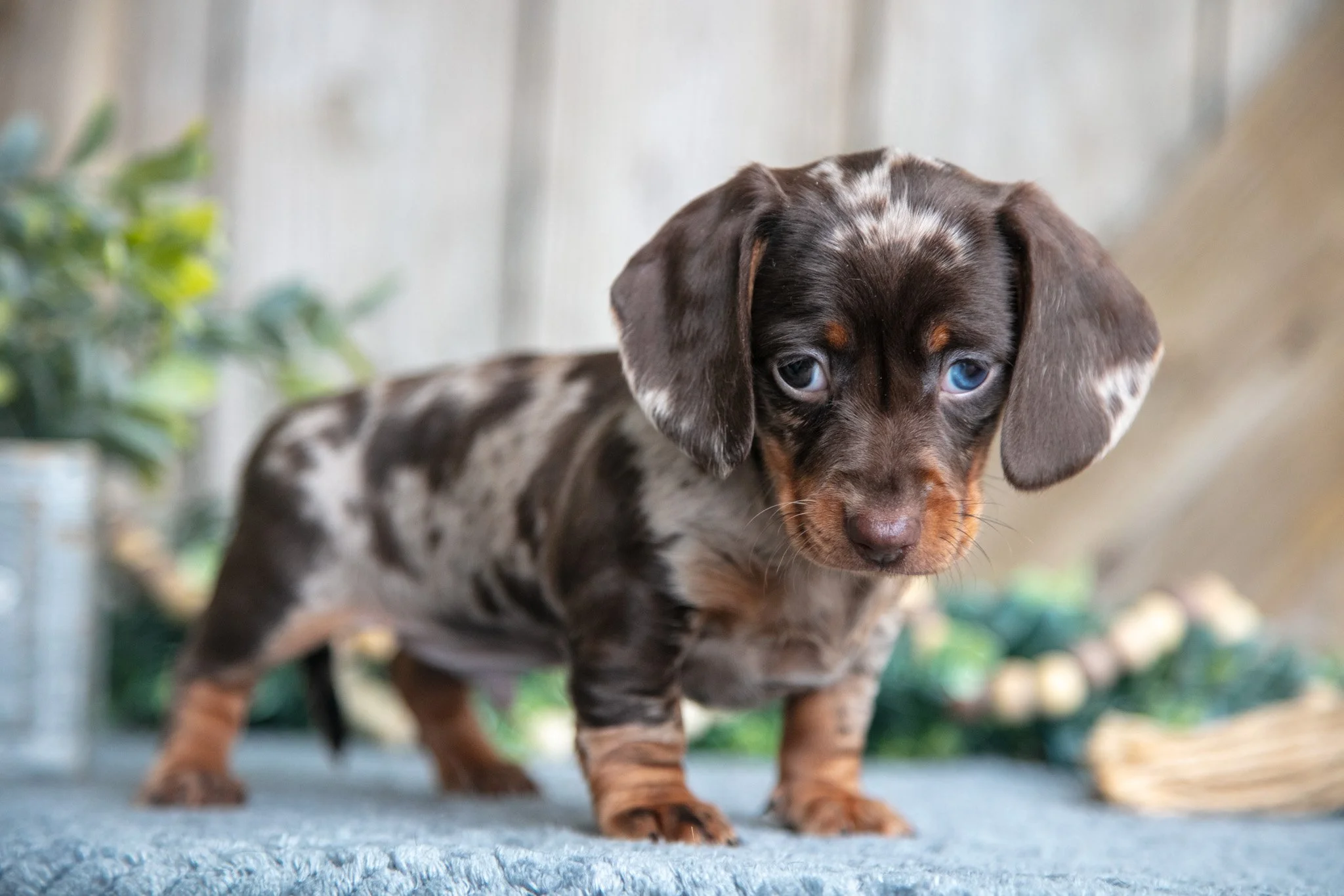Say hello to Leader! This adorable Mini Dachshund puppy is ready to spoil you with love and attention. This charming puppy is family raised and will be sure to keep you on your toes. These pups will be vet checked, microchipped, AKC registered and up to date on shots and wormer! To welcome this perfect pooch into your home, please contact us today!