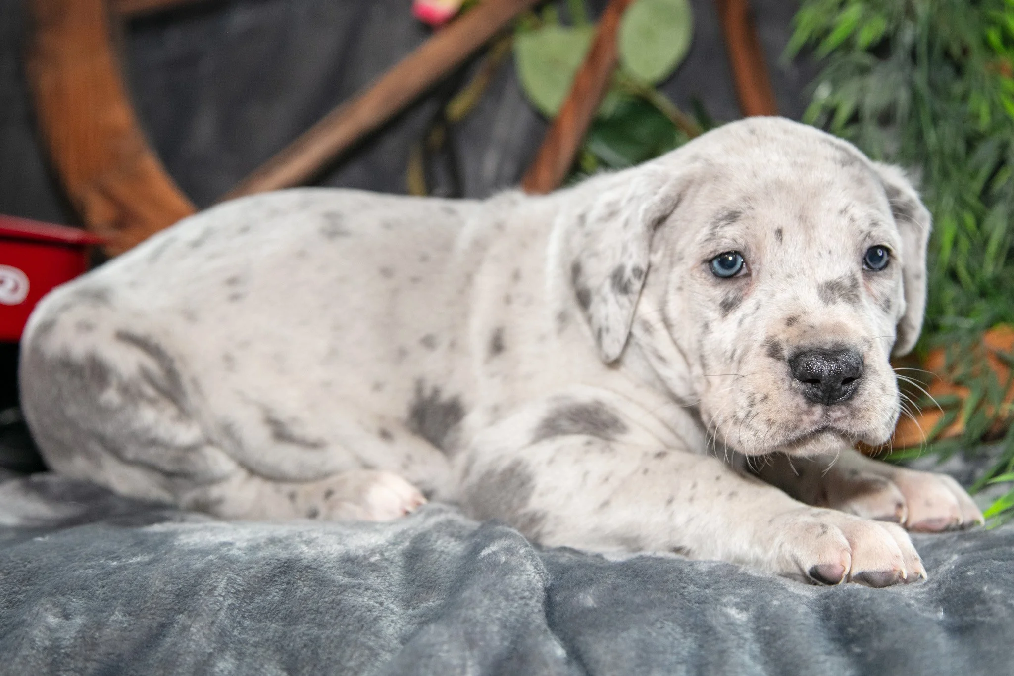 Say hello to Sugar! This darling Great Dane puppy is one of a kind and ready to adventure with you. She is family raised with children and is extra spoiled with love and attention. She will be vet checked, microchipped, up to date on vaccinations and wormer and AKC registered. The pups also come with the peace of mine of a genetic health guarentee provided by the breeder! To learn more about these beautiful pups, please contact us today!