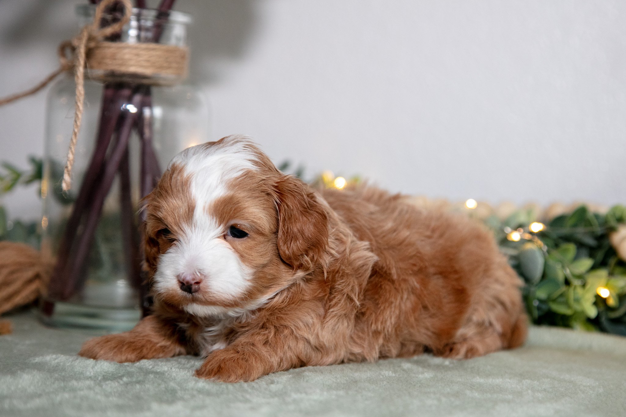 Here comes Joey! This darling Maltipoo puppy loves to snuggle. He is filled to the brim with love and affection. This pup is family raised, loves to adventure and will fit in great with any family. He will be vet checked and up to date on shots and wormer! To welcome this adorable puppy into your home, please contact us today!