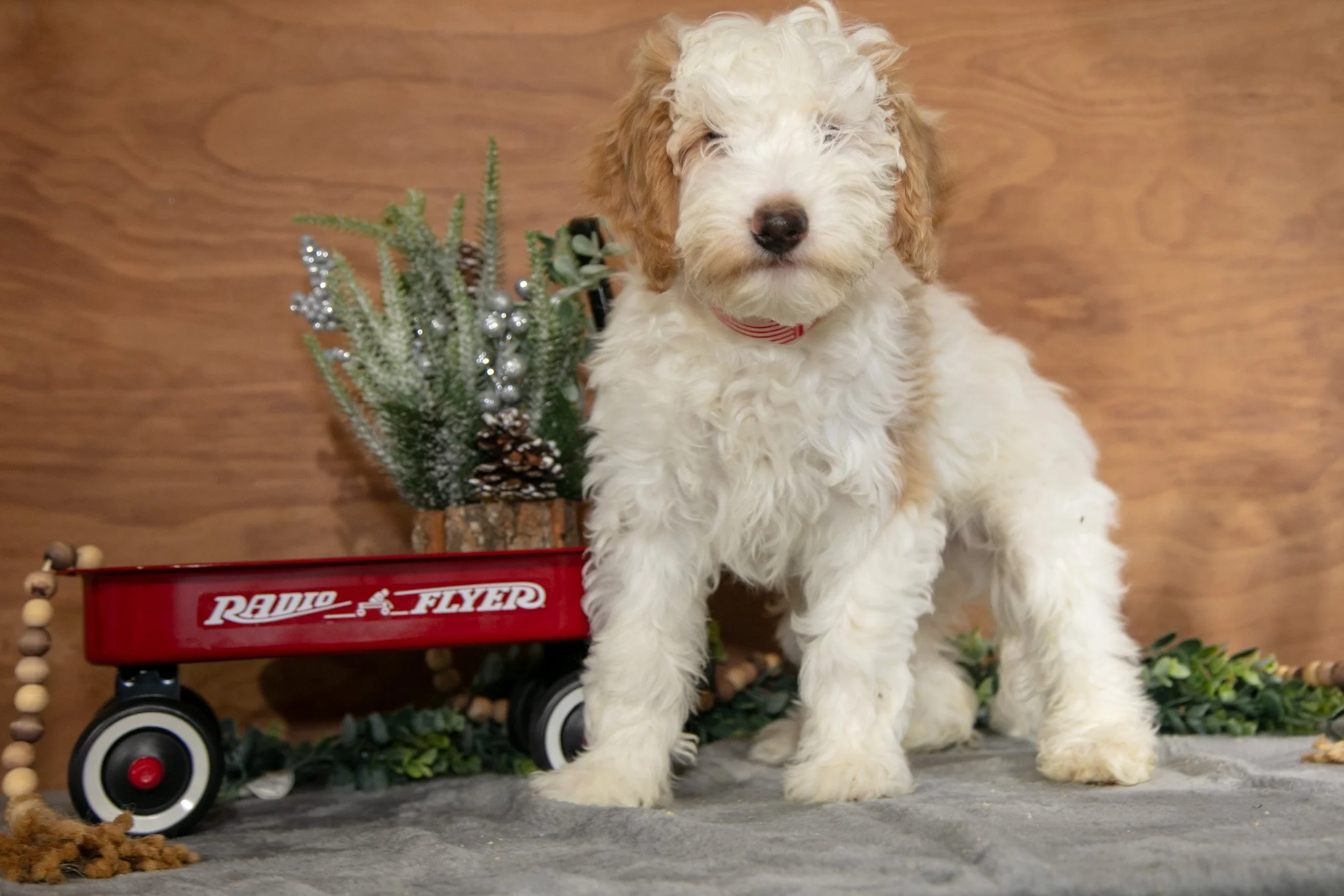 Here comes Henry! This adorable Mini Goldendoodle puppy loves to play and would love to snuggle up with you! He is family raised and will make a wonderful addition to any family. They will be vet checked and up to date on shots/wormer. They also come with a health guarantee provided by the breeder! To learn more about this curly cutie, please contact us today!