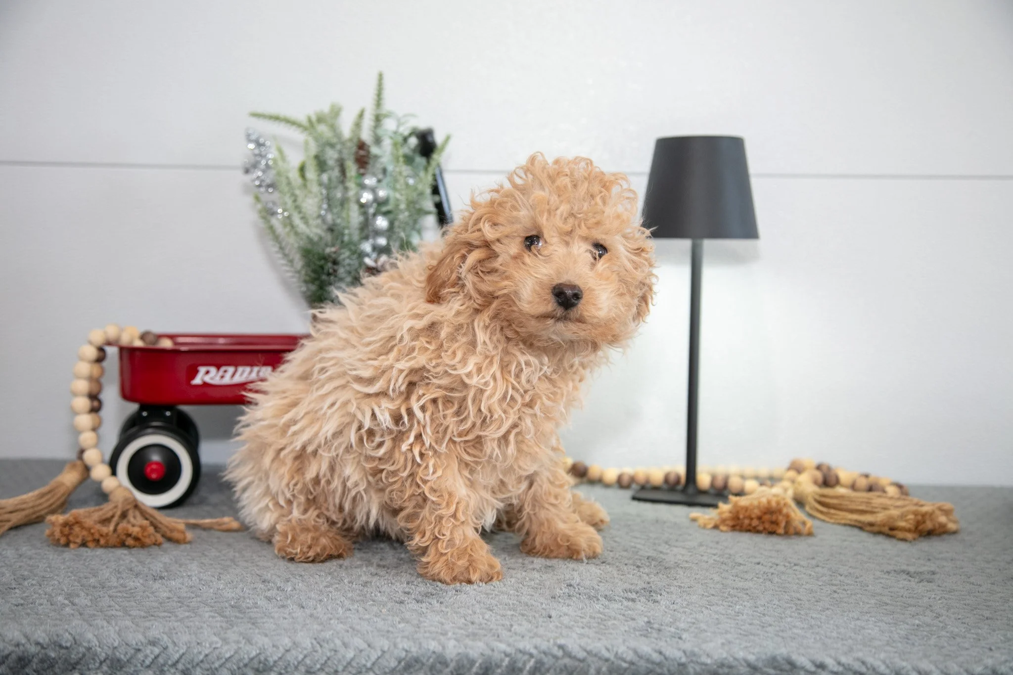 Say hello to Maverick! This adorable Mini Goldendoodle puppy loves to play and can’t wait to meet you! These puppies are family raised and will make a wonderful addition to any family. They are up to date on shots/wormer. To learn more about this curly cutie, please contact us today!