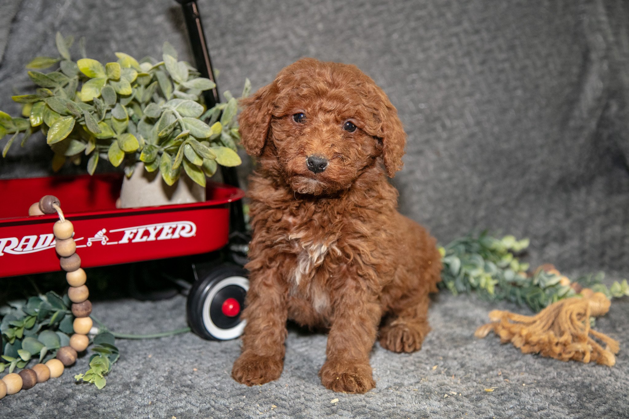 Here comes Brooks! This cute and curly Miniature Poodle puppy would love to cuddle up with you. He is family raised and loves to play outside and run around. He is up to date on shots and wormer, will be vet checked, and includes a genetic health guarantee provided by the breeder! To learn more about this adorable puppy, please contact us today!