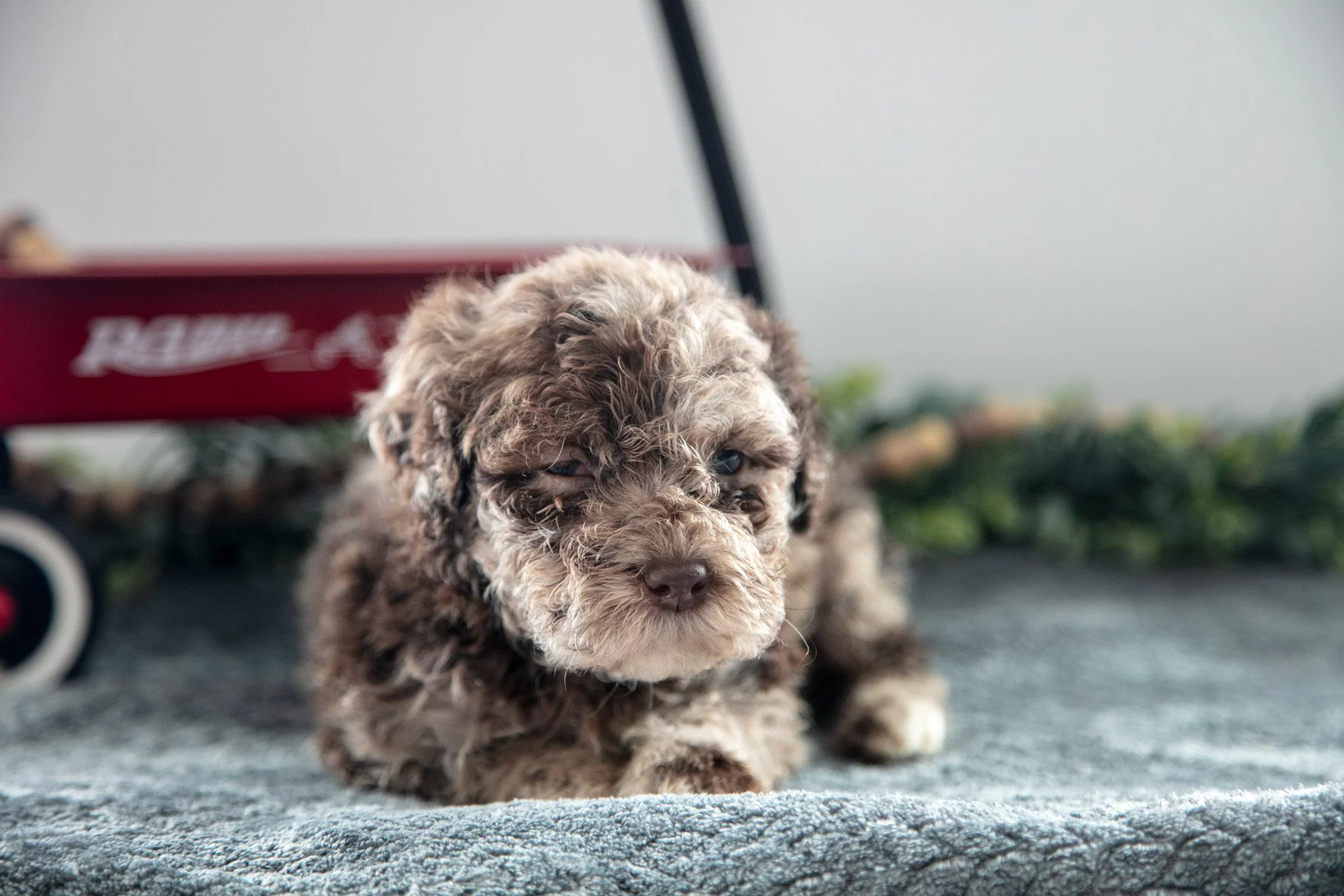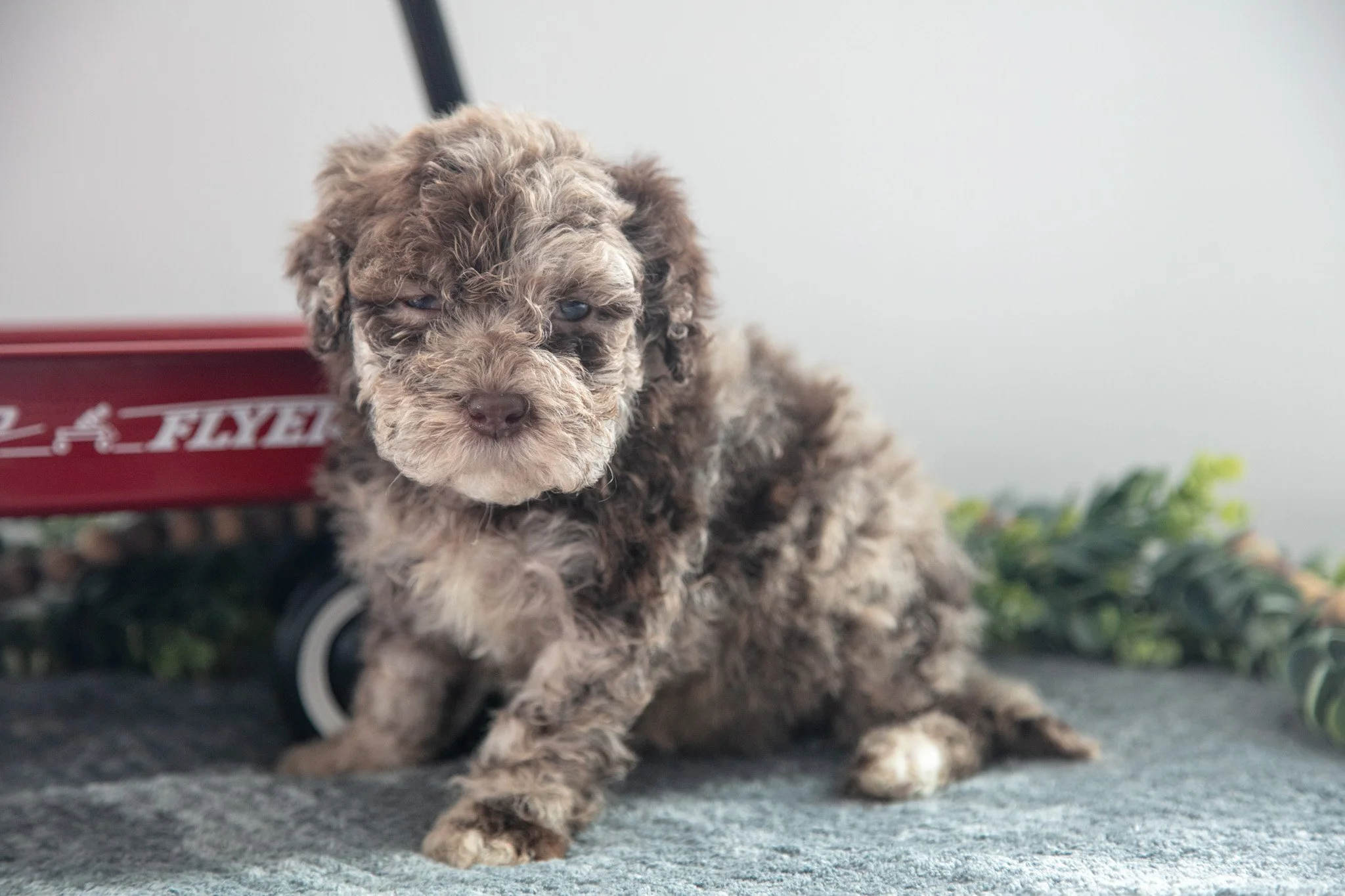 Everyone meet Caramel! This cute and curly Miniature Portadoodle puppy is full of life and ready to spoil you with love. This puppy has boundless energy and would love to adventure with you. These puppies are family raised and love to play outside and run around. They are up to date on shots and wormer and vet checked! To learn more about these darling puppies, please contact us today!