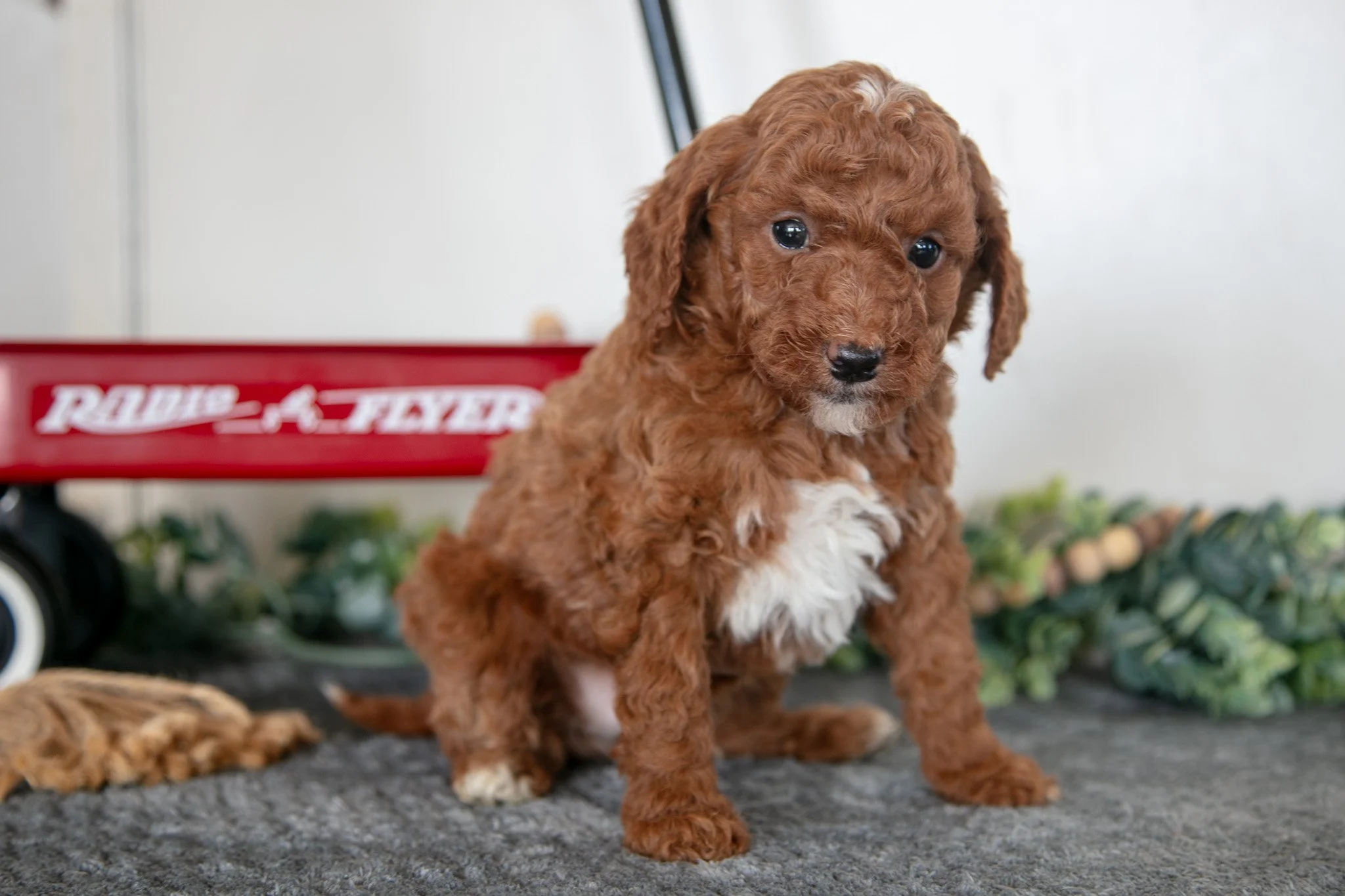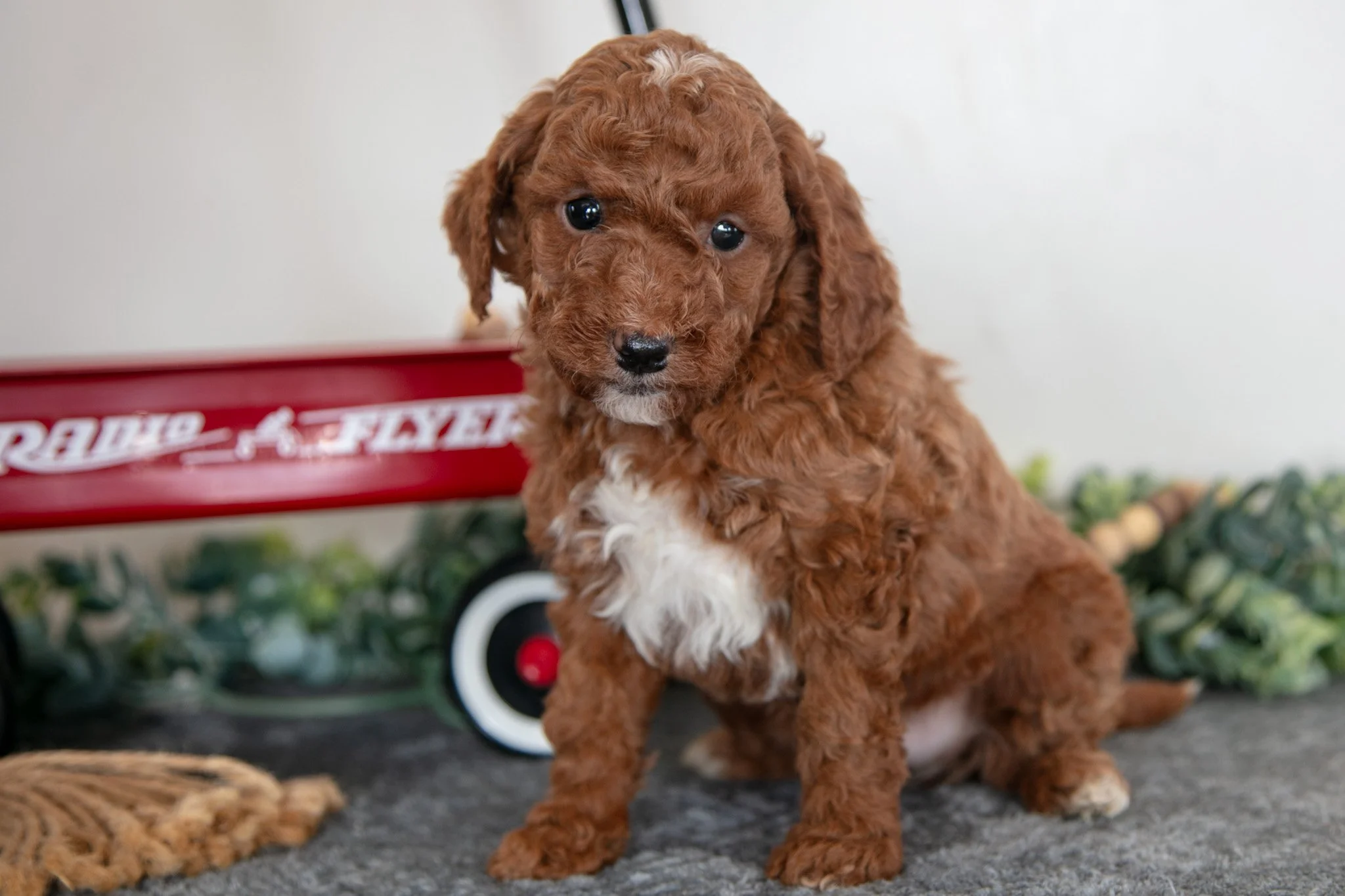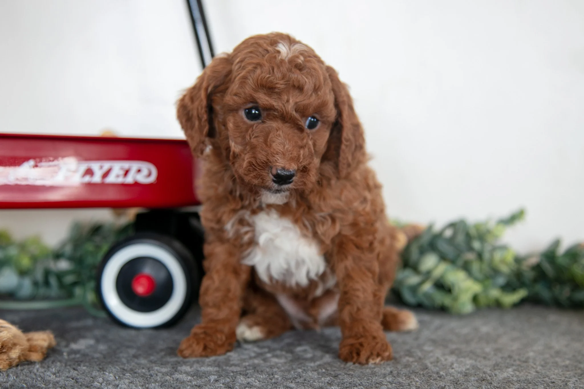 Here comes Freddy! This cute and curly Miniature Poodle puppy would love to cuddle up with you. He is family raised and loves to play outside and run around. He is up to date on shots and wormer and will be vet checked! To learn more about this adorable puppy, please contact us today!