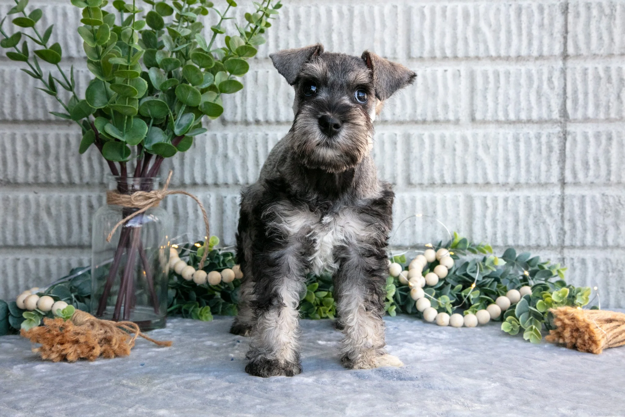 Here comes March! This adorable Mini Schnauzer puppy is filled to the brim with love and will be sure to make a wonderful companion. She is very playful and would love to adventure with you! These adorable pups are family raised and will fit in well with any family. They will be vet checked, microchipped, up to date on shots and wormer, registered with the AKC, and come with a one year genetic health guarantee provided by the breeder. To learn more about these sweet puppies, please contact us today!