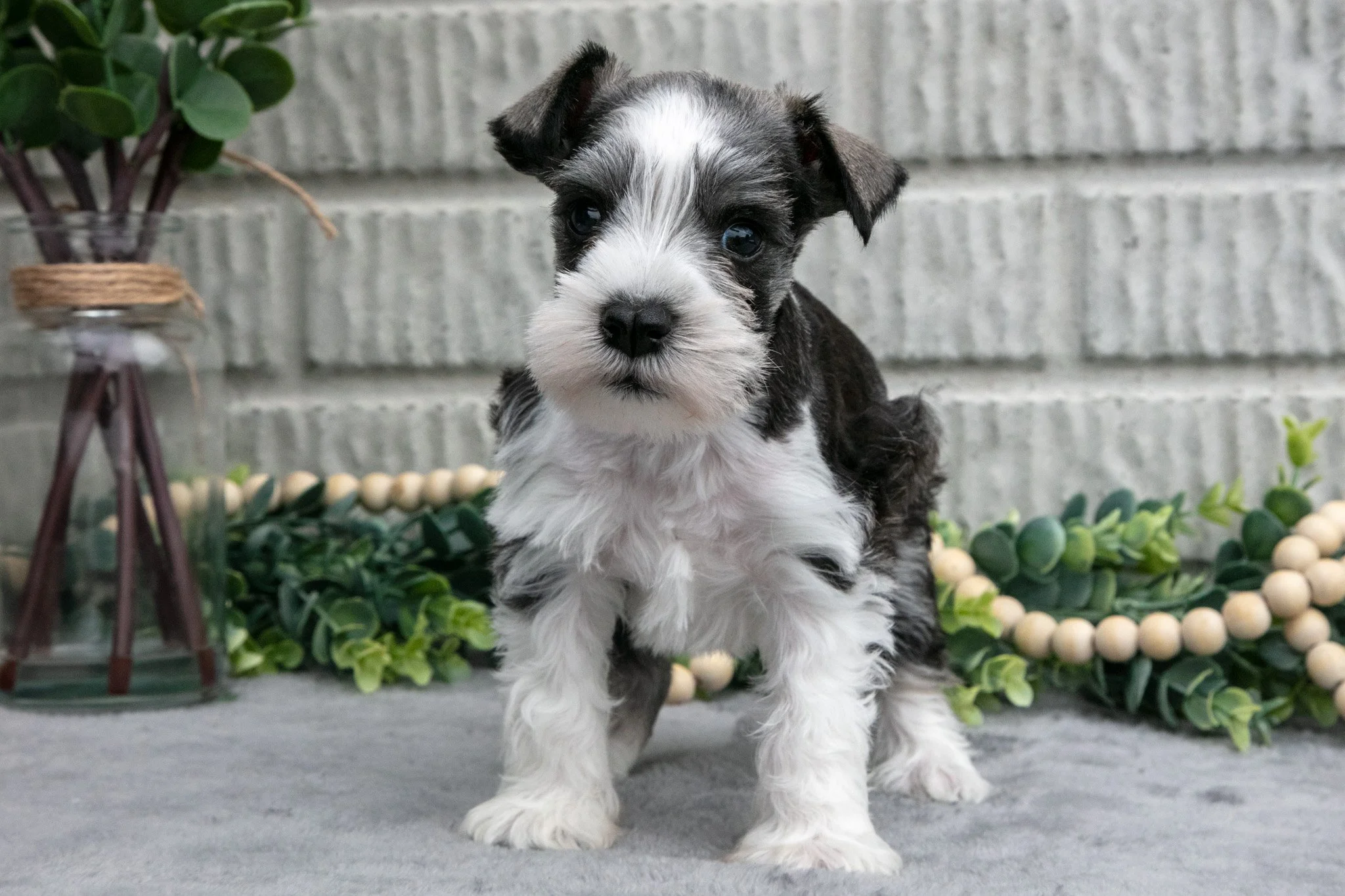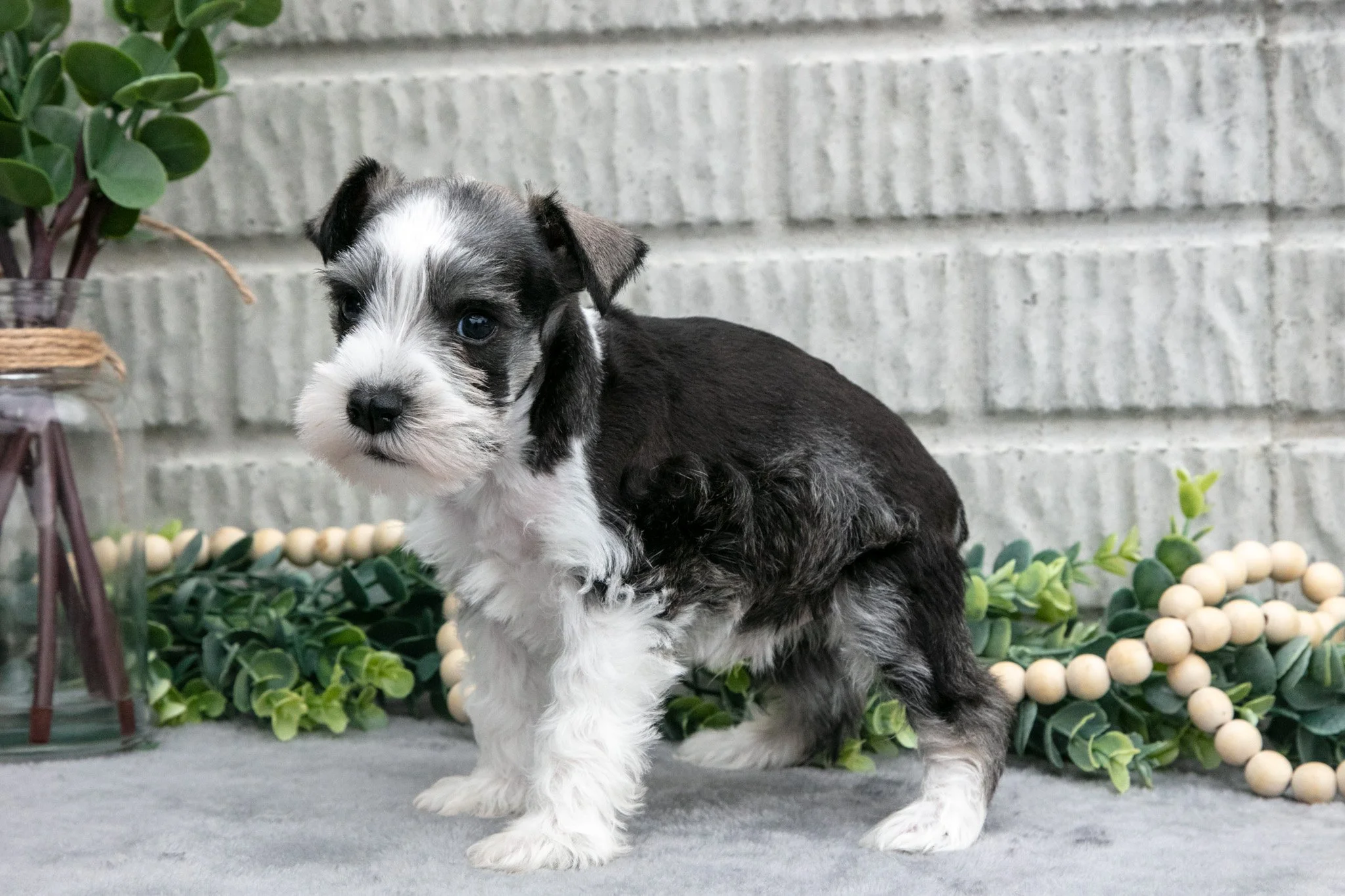 Here comes Mickey! This adorable Mini Schnauzer puppy is filled to the brim with love and will be sure to make a wonderful companion. He is very playful and would love to adventure with you! These adorable pups are family raised and will fit in well with any family. They will be vet checked, microchipped, up to date on shots and wormer, registered with the AKC, and come with a one year genetic health guarantee provided by the breeder. To learn more about these sweet puppies, please contact us today!