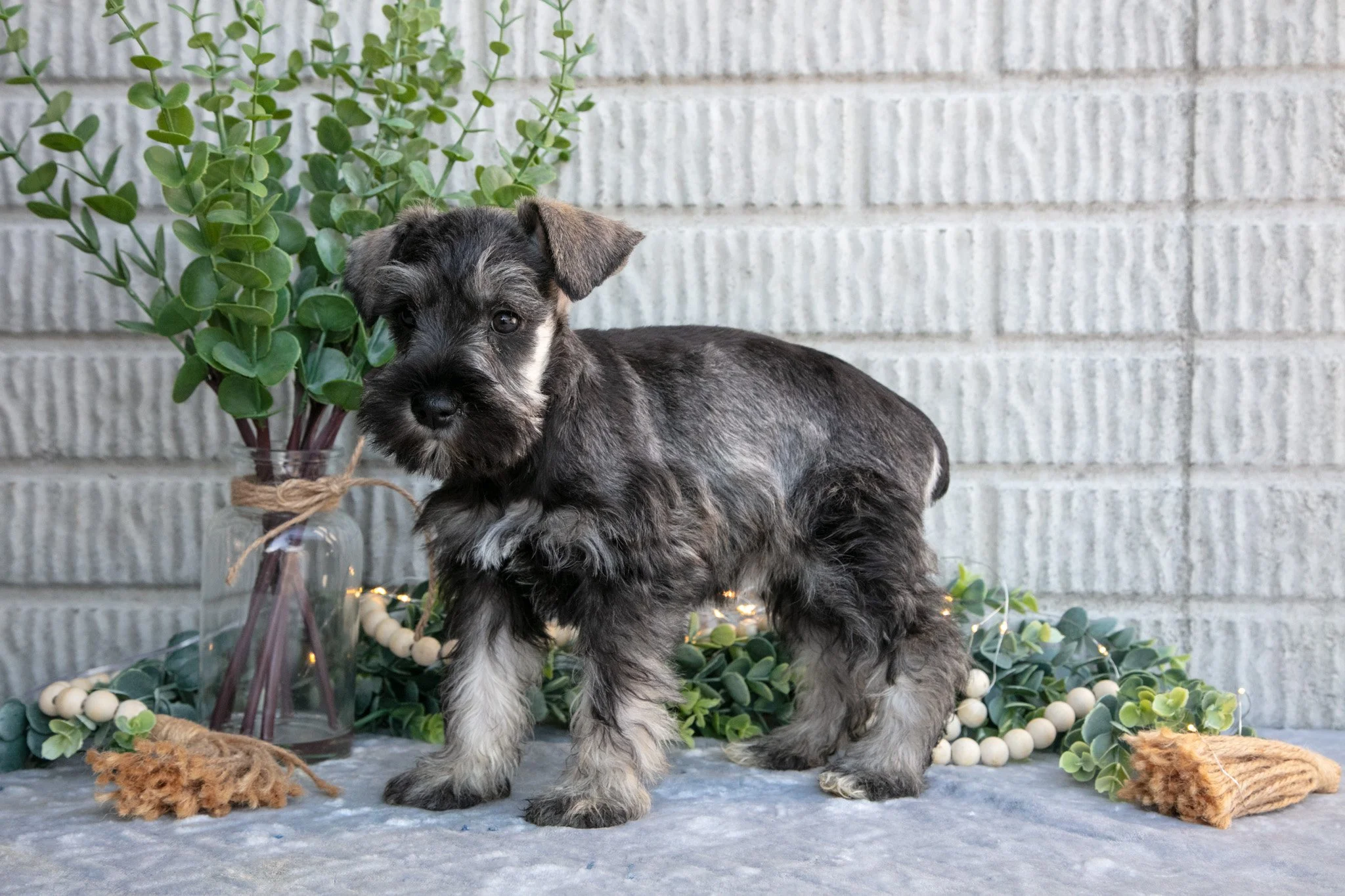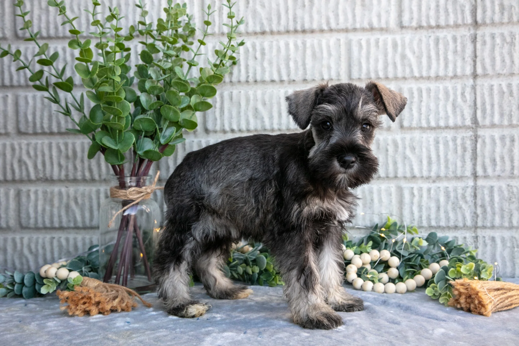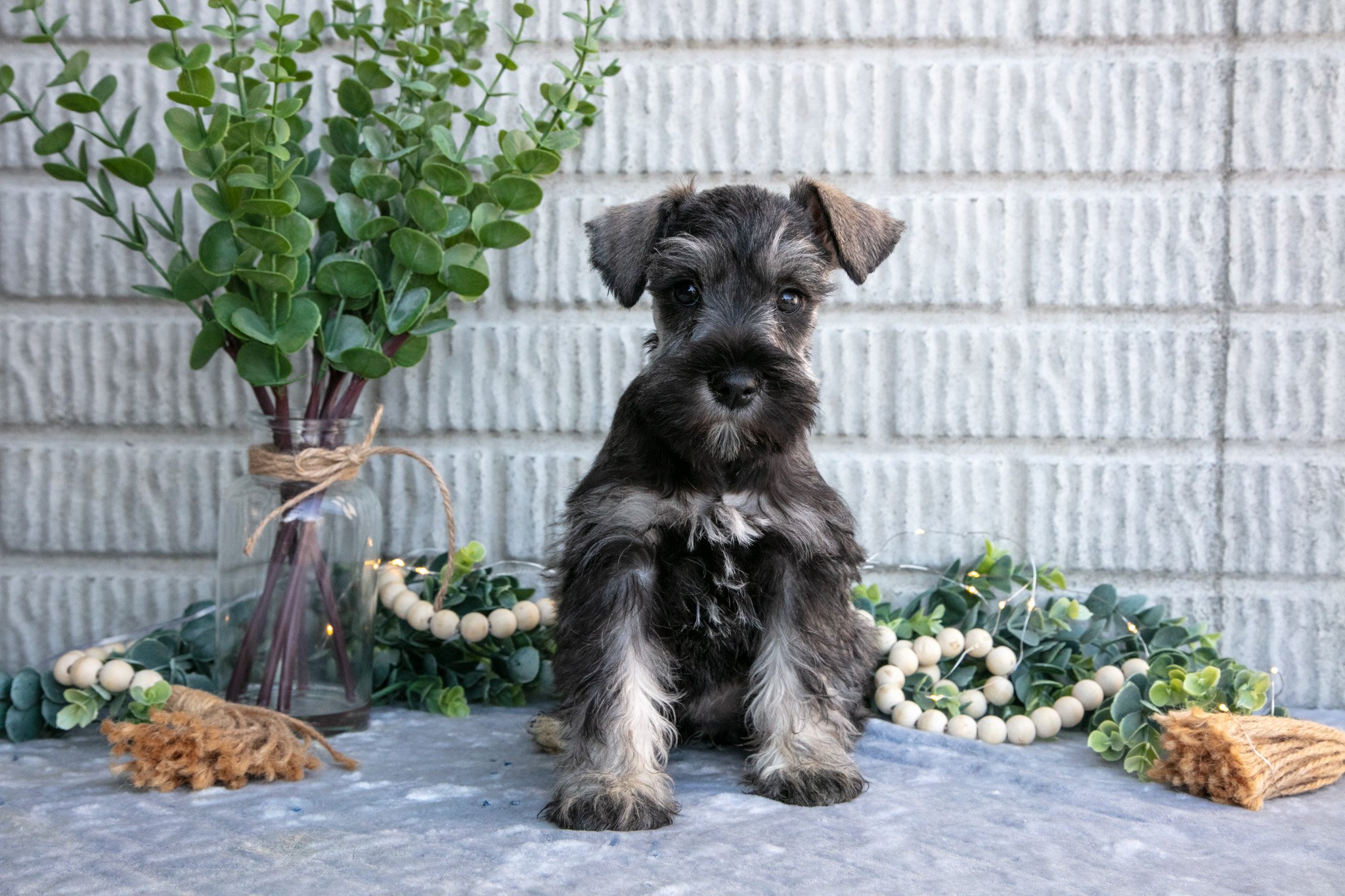 Here comes Penny! This adorable Mini Schnauzer puppy is filled to the brim with love and will be sure to make a wonderful companion. She is very playful and would love to adventure with you! These adorable pups are family raised and will fit in well with any family. They will be vet checked, microchipped, up to date on shots and wormer, registered with the AKC, and come with a one year genetic health guarantee provided by the breeder. To learn more about these sweet puppies, please contact us today!