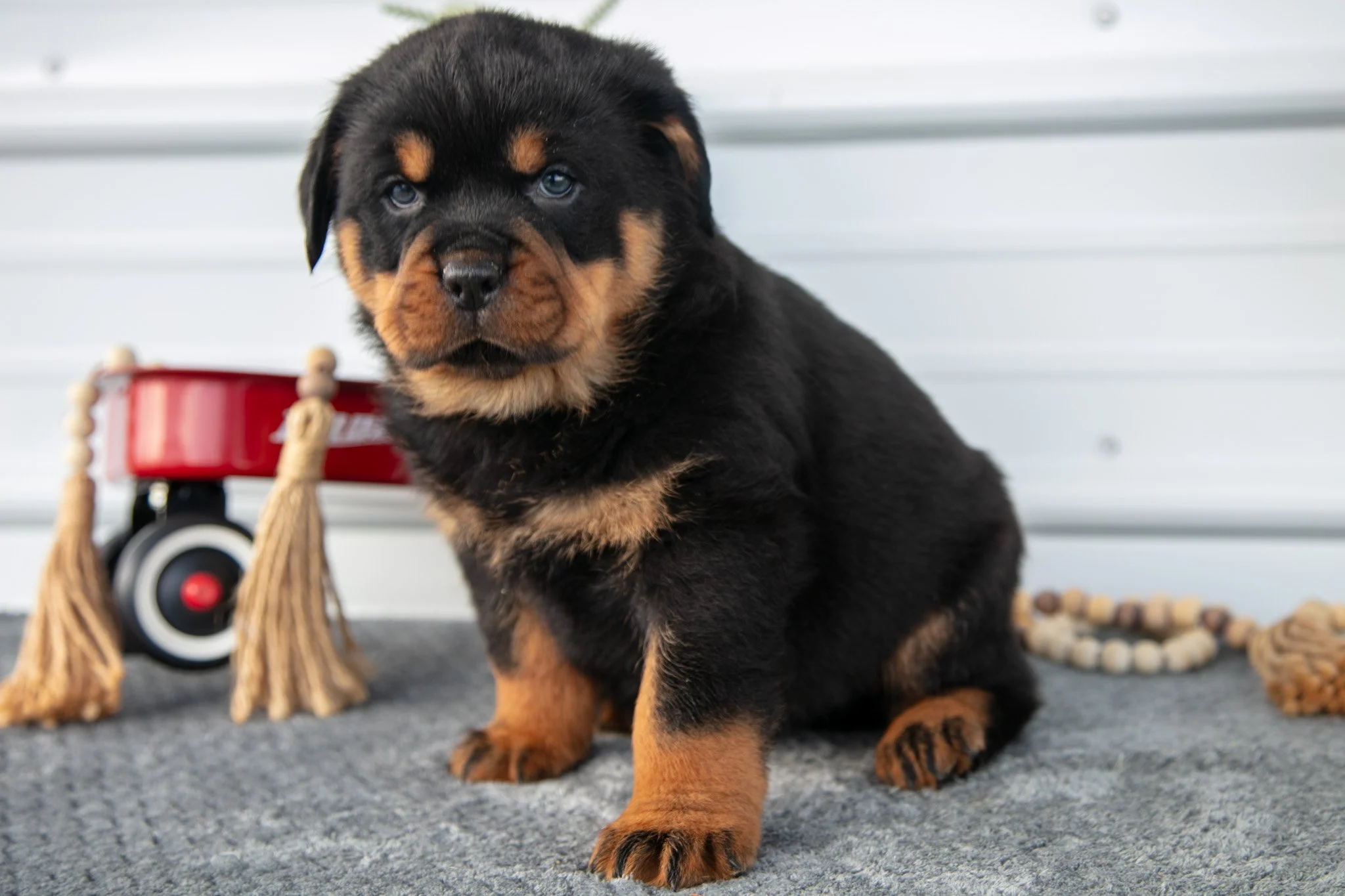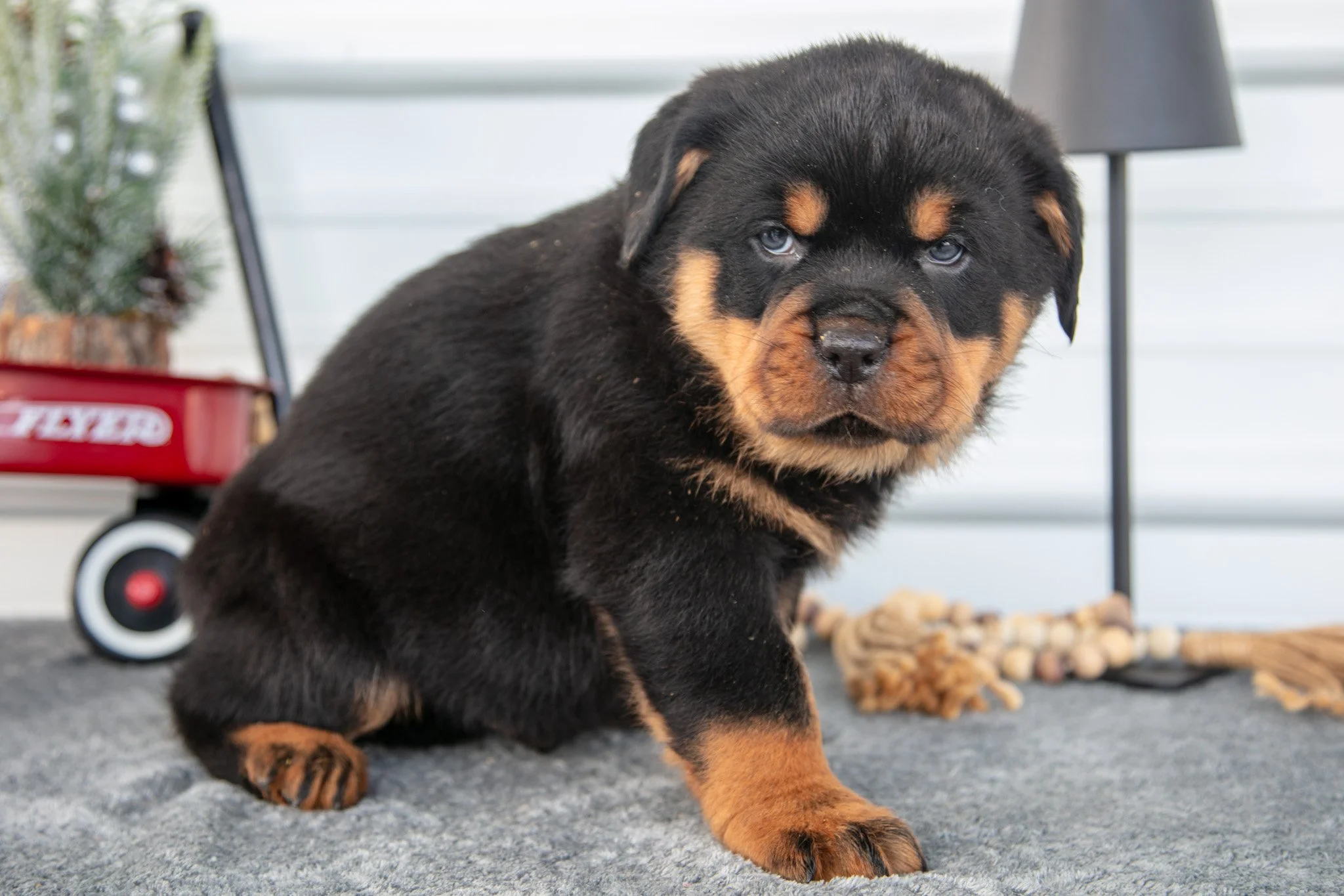 Say hello to Hayden! This adorable Rottweiler puppy is one of a kind and is ready to snuggle with you! He is family raised and loves to be the center of attention. He will be up to date on shots and wormer and registered with the AKC! To learn more about this adorable puppy, please contact us today!